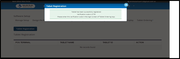 7. Tablet registration confirmation screen will pop in with the registration code.