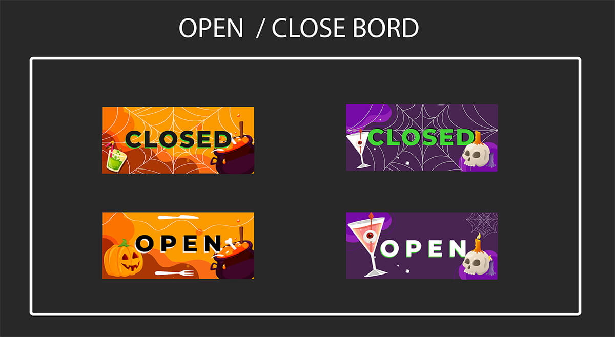 Make a haunting first impression with your restaurant's storefront signage. Our Halloween design templates for open/close boards will grab the attention of passersby and beckon them in for a deliciously eerie dining experience.